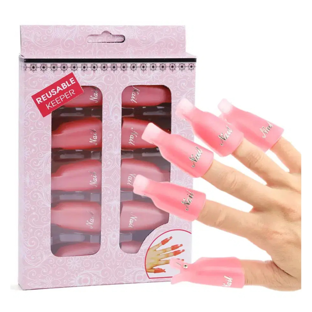 These 10pc Soakers (Clip Caps) are designed for easy and effective nail polish, gel, or acrylic removal. Made from high-quality, durable plastic, these clip caps are reusable and perfectly shaped to fit any finger size. Ideal for both home and professional use, they create a snug fit over cotton pads soaked in acetone or nail polish remover, ensuring thorough and efficient removal of nail products without damaging the natural nail bed.